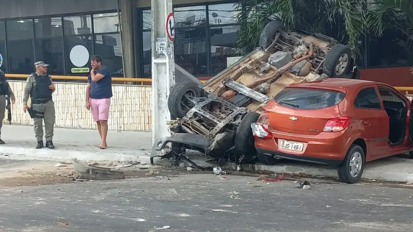 Com o impacto, o veículo capotado subiu a calçada da avenida Antônio Basílio, próximo a um supermercado, danificando a mureta do estabelecimento. O outro carro envolvido também foi parar sobre a calçada.