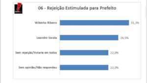 A pesquisa AgoraSei/Blog Gustavo Negreiros mostra que Wilsinho Ribeiro é o mais rejeitado com 31,3% dos entrevistados. Leandro Varela vem com 26,5% já sem rejeição/sem opinião são 22%.