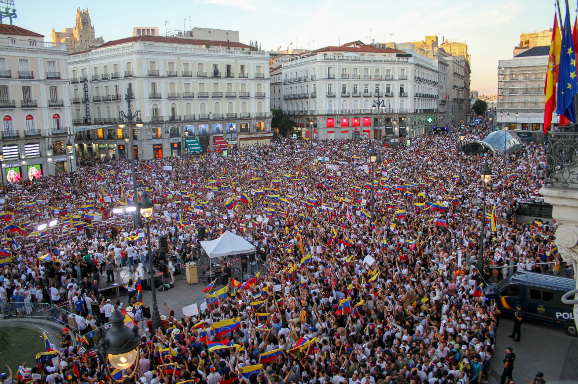 Em Madri, milhares de manifestantes se reuniram na praça Puerta del Sol para expressar seu apoio aos líderes da oposição na Venezuela e em protesto contra o regime de Maduro.